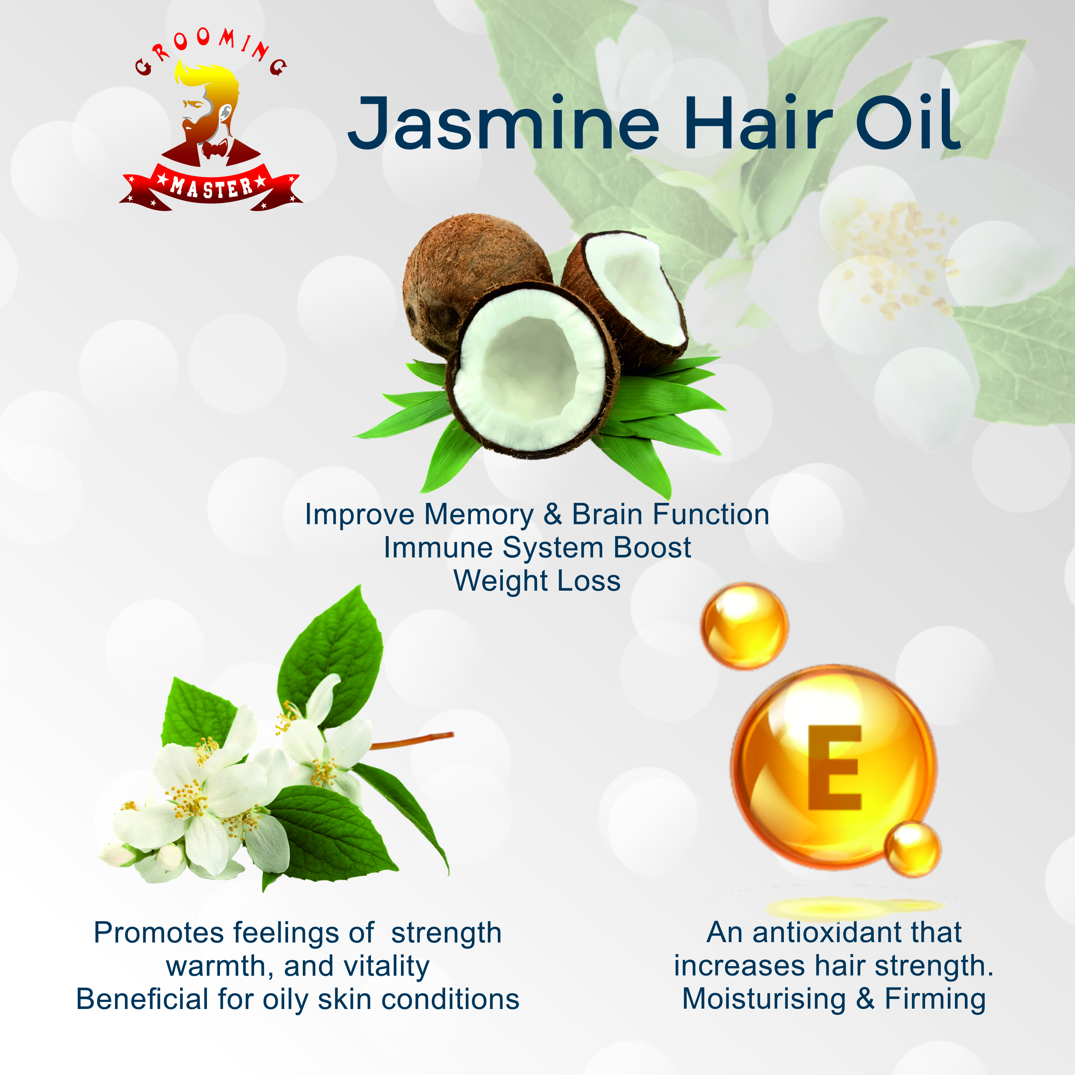 The main chemical components that are presented in jasmine oil includes benzyl acetate, linalool, benzyl alcohol, indole, benzyl benzoate, cis-jasmone, geraniol, methyl anthranilate and trace amounts of p.